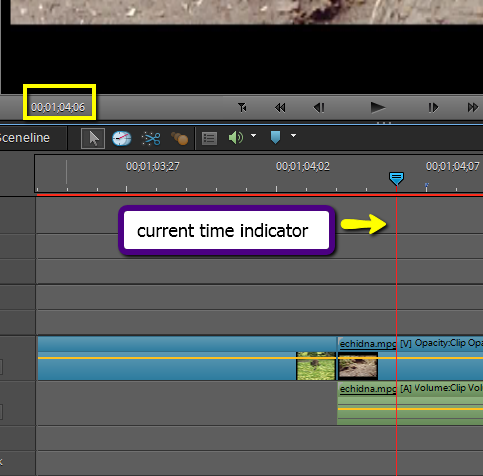 From the graphic, you can see that the koala video is longer than both the universal counting leader and the echidna video clips. You can also see that each of these three clips has both a video and audio track associated with it. Video shot with a video camera will have both an audio component and a video component. You can use both components in your video or separate them and remove the audio if you do not want to use it (can also keep the audio and remove the video if needed). Notice the kangaroo clip has no audio because it was a still, digital image. The timeline allows you to incorporate layered or composited clip, a feature not available in the sceneline view. Notice that there are more video/audio tracks so that media can be layered. This is what allows you to overlay text, graphics or sound effects. You also can add more tracks than what is shown here if you wish. The bottom two tracks shown in the graphic are typically used for your narration and music soundtrack. The ruler on the at the top of the timeline gives you specific information on the length of a video clip.