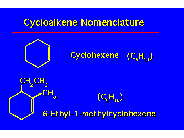 | To number the cycloalkene, one carbon of the C=C is given the number 1 and the other carbon of the C=C is given the number 2. Numbering is done to give the alkyl groups the lowest possible numbers. | ![]() |