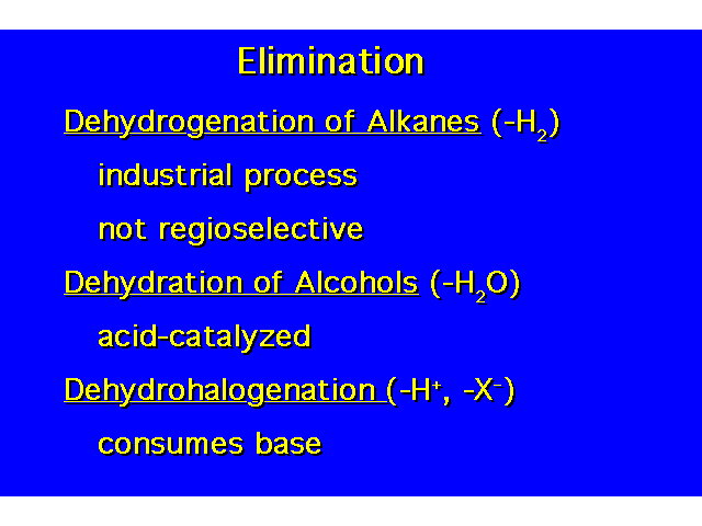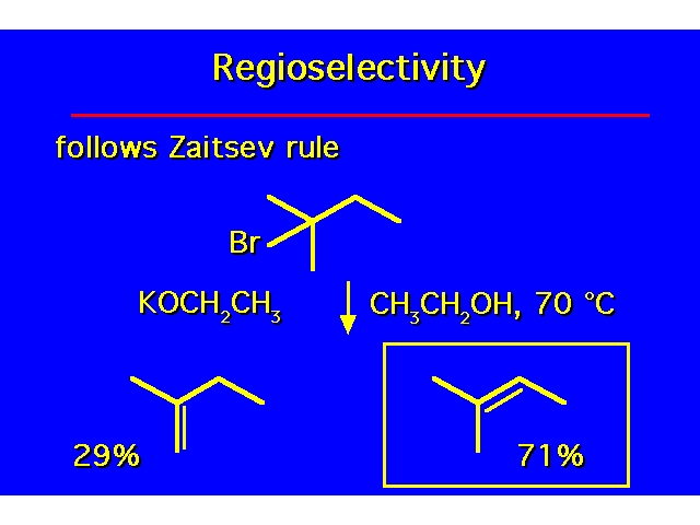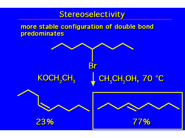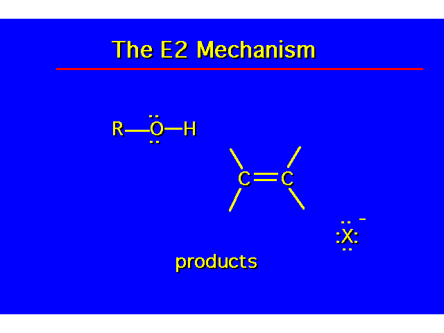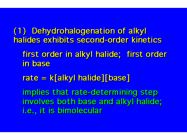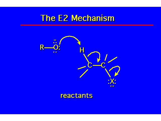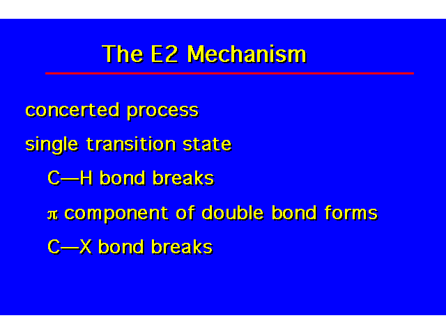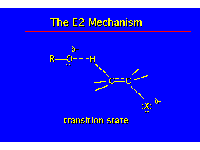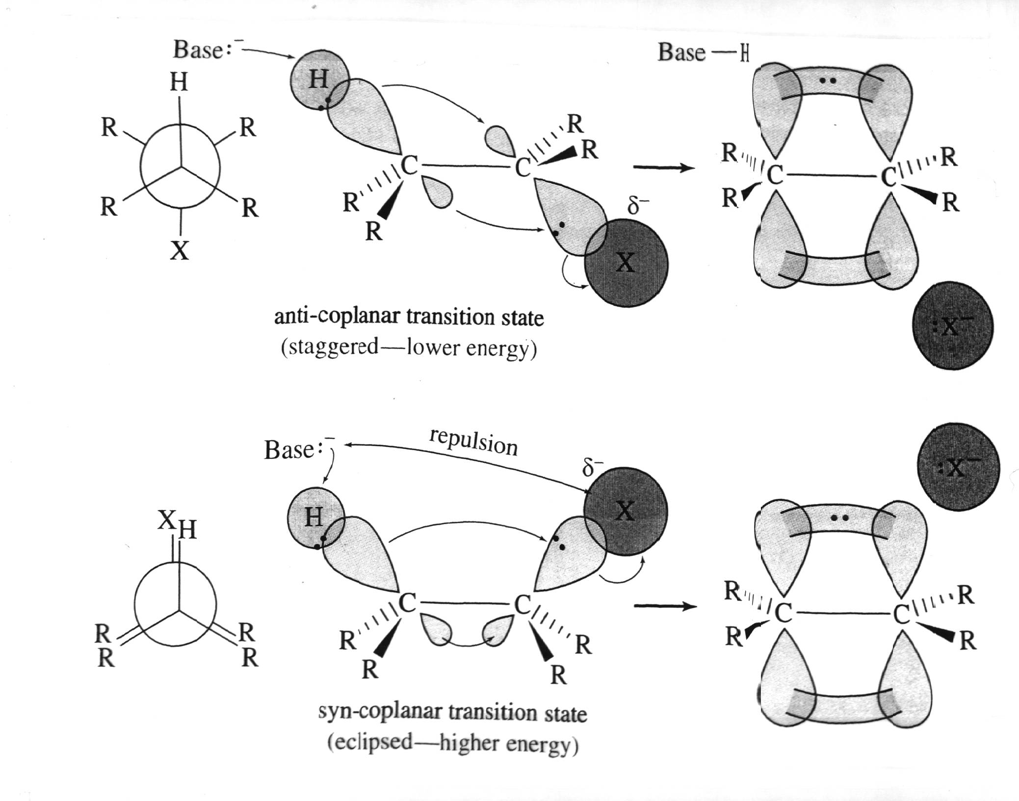 ![]() In the concerted reaction, the orbitals of the hydrogen atom and the halide must be aligned so that they can begin to form a pi bond in the transition state. All the atoms of the H-C-C-X unit need to be in the same plane (periplanar). This can occur when the H and X are synperiplanar or anti periplanar. In syn periplanar the adjacent bonds are eclipsed. In the antiperiplanar arrangement, the adjacent bonds are staggered (a lower energy arrangement). | ![]() |