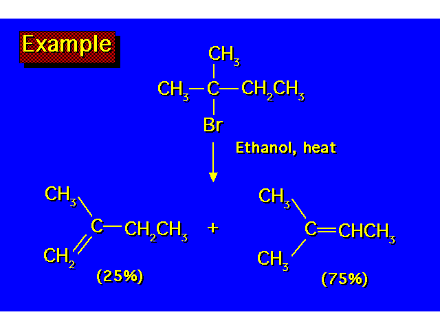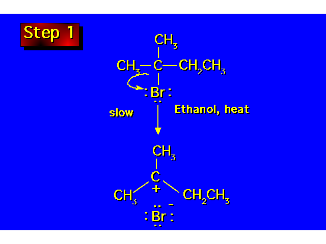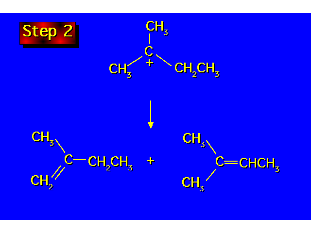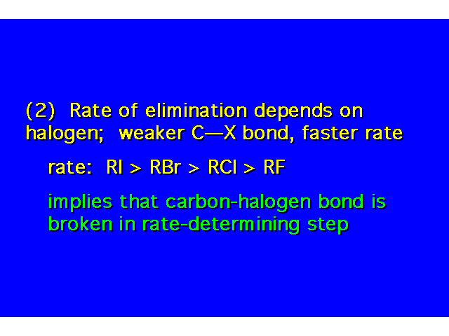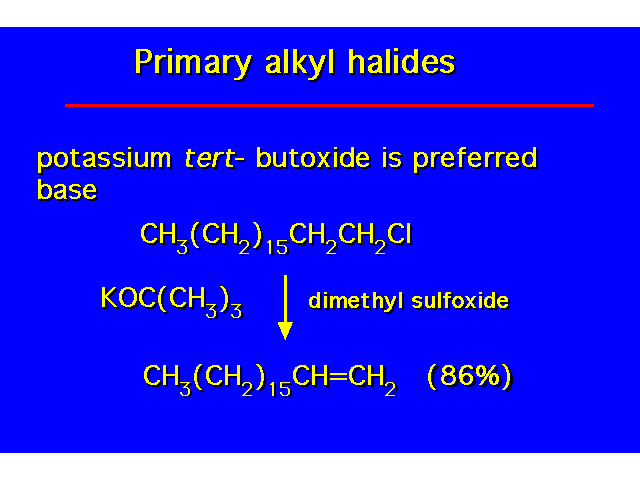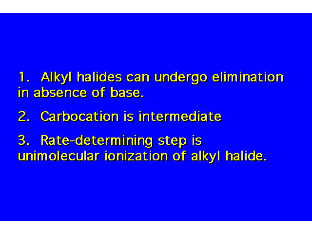 | When the alkyl halide is tertiary, dehydrohalogenation can follow a two step process in which the C-halogen bond breaks first to give a carbocation intermediate, followed by deprotonation of the carbocation in a separate step. This is an E1 mechanism, and works for tertiary halides because tertiary carbocations are quite stable. Sometimes secondary alkyl halides will utilize an E1 pathway. In these reactions, the base that extracts the beta hydrogen is a molecule of the solvent. | ![]() |