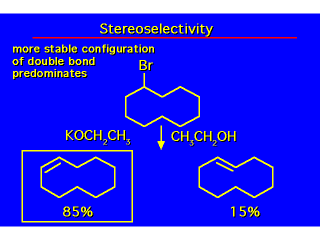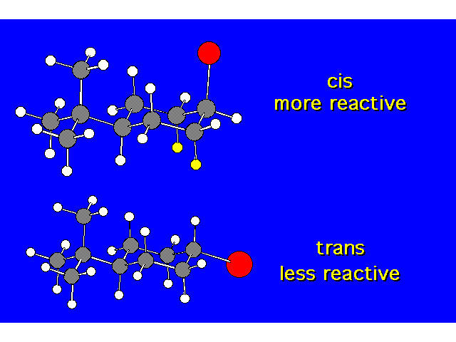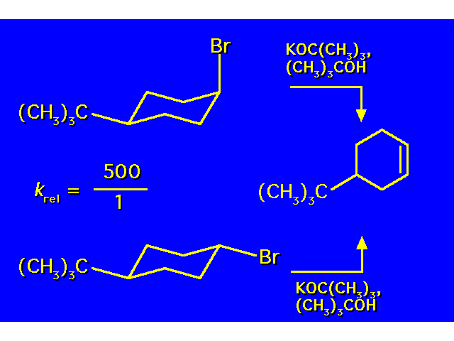 | In the cis compound, there is a hydrogen anti to the axial halide allowing anti elimination. In the trans compound, the equatorial halide is gauche to both hydrogens on the adjacent carbon, and anti elimination is not possible. | ![]() |