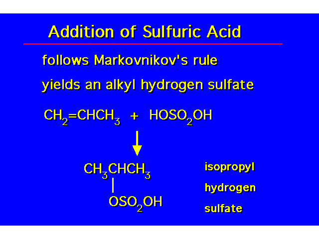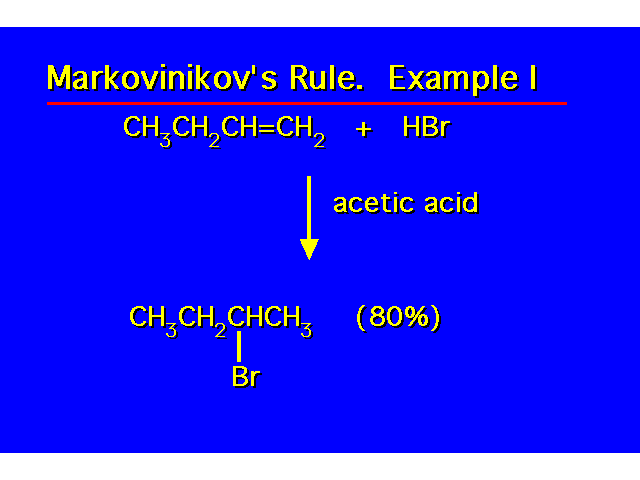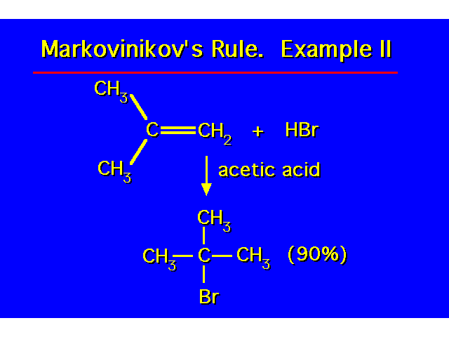 | MARKOVNIKOV'S RULE The hydrogen of the HX is added to the carbon which has the greater number of hydrogens and the halogen is added to the carbon which has the lesser number of hydrogens. | ![]() |