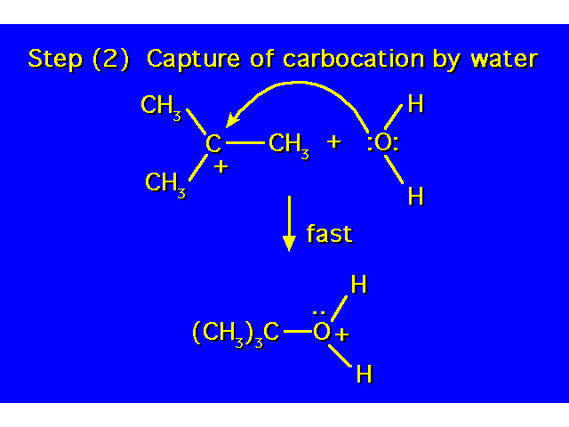 | The carbocation seeks a pair of electrons. In this reaction mixture there is a lot of water which acts as a nucleophile. The carbocation can rearrange if a more stable carbocation can be formed before reacting with the nucleophile. | ![]() |