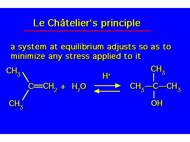 | The amount of water present in the reaction mixture determines the position of equilibrium. In the dehydration reaction, concentrated H2SO4is used .... there is little water so equilibrium lies to the left. In the hydration reaction, an aqueous H2SO4 solution is used .... there is lots of water so equilibrium lies to the right. | ![]() |