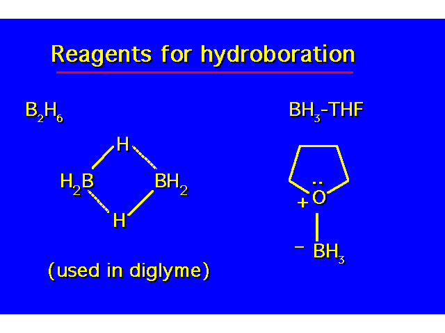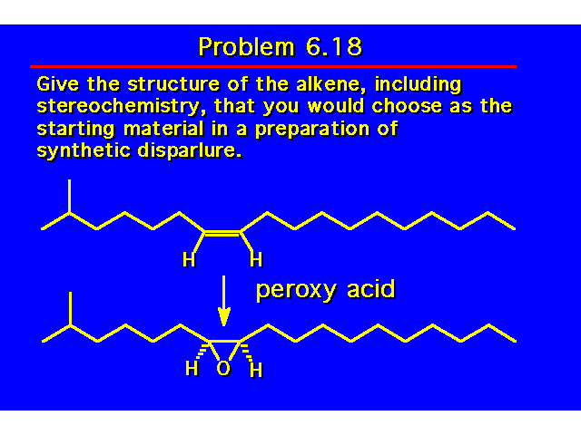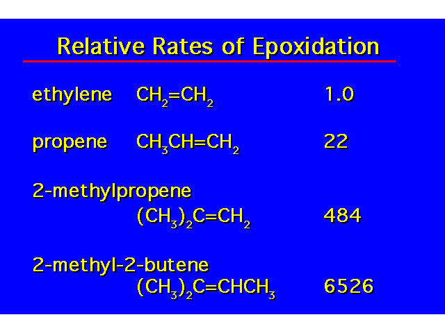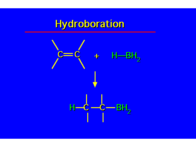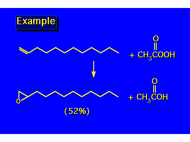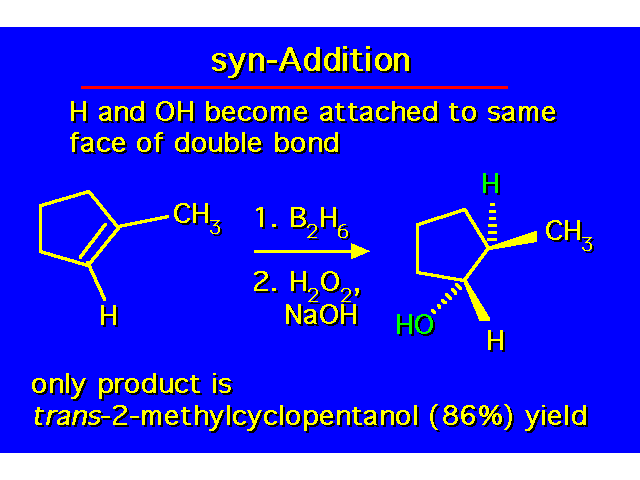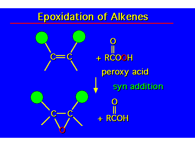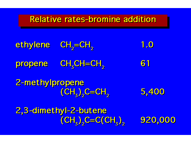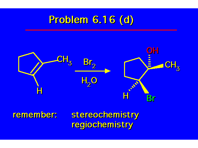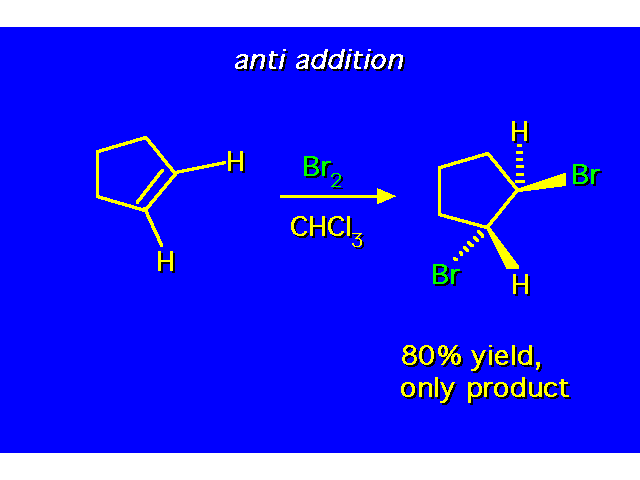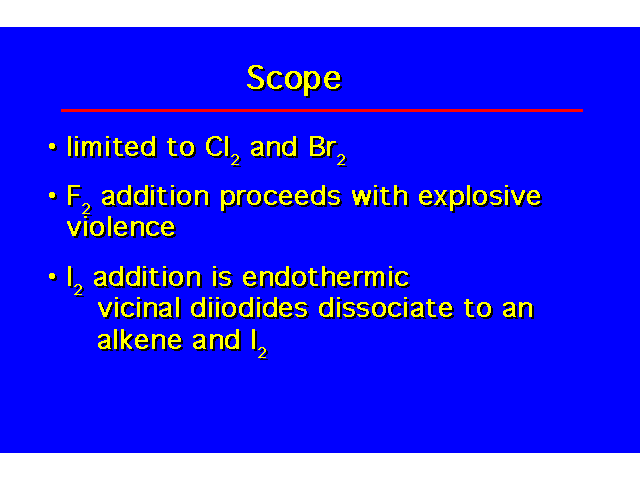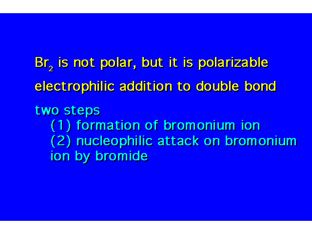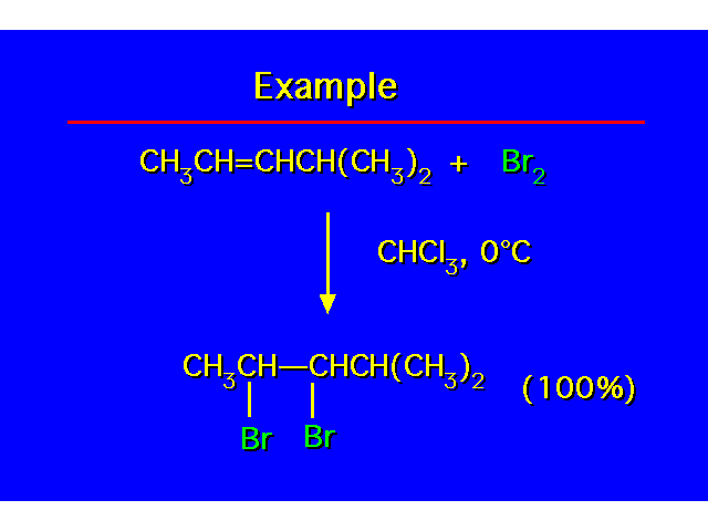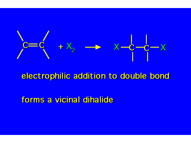| The solvent for this reaction is typically either CHCl3 or CCl4. This reaction can be observed visually and provides a test for the presence of C=C. Bromine is orange-red in color. The vicinal halide is colorless. As the bromine is added to the C=C, the color of the bromine disappears. The bromine is decolorized. | ![]() |