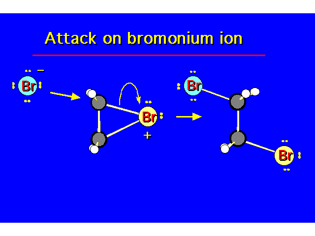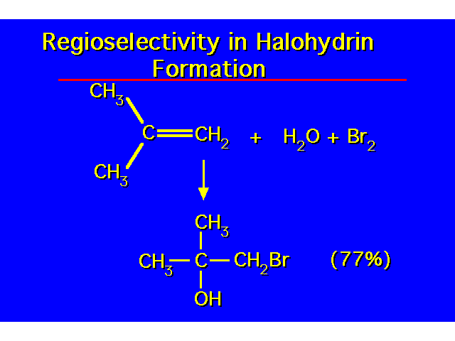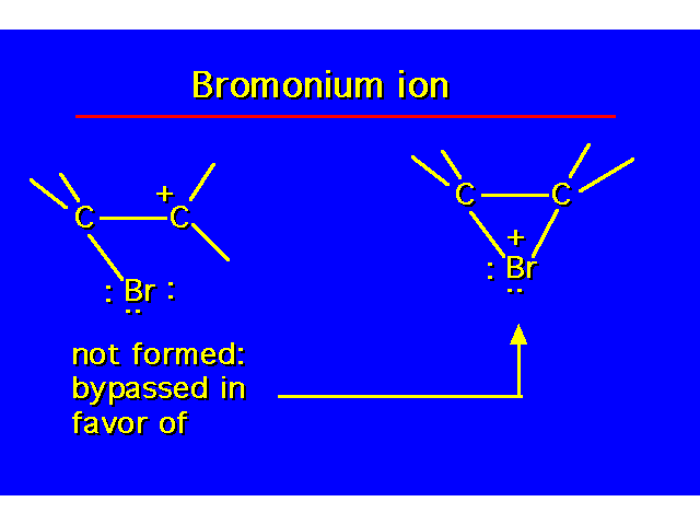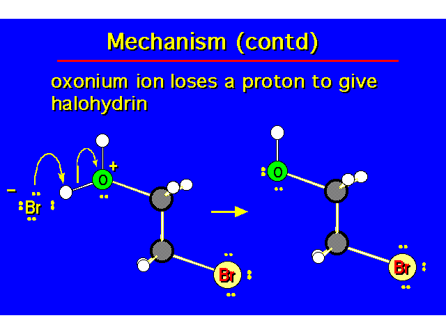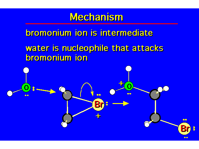 | The second step involves attack of a nucleophile. There are two nucleophiles present -- Br- and water. Since the water is present in a much larger amount, it interacts with the bromonium ion. In this case the solvent (H2) can act as a nucleophile. CCl4 is not nucleophilic and does not interact with the bromonium ion when it is the solvent. | ![]() |