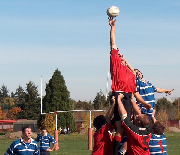 This is called a "lineout". It happens when one team kicks, or runs the ball out of bounce. Not like football, if you take the ball out of play, it is considered a turn over. There are two sets of lifters (two on each side), and a jumper. The hooker will be on the sideline and throw the ball between the two teams (they are about a meter apart), and the jumpers are lifted into the air and they try to tip the ball to their team. My man Cory won this lineout against against the University of Portland.