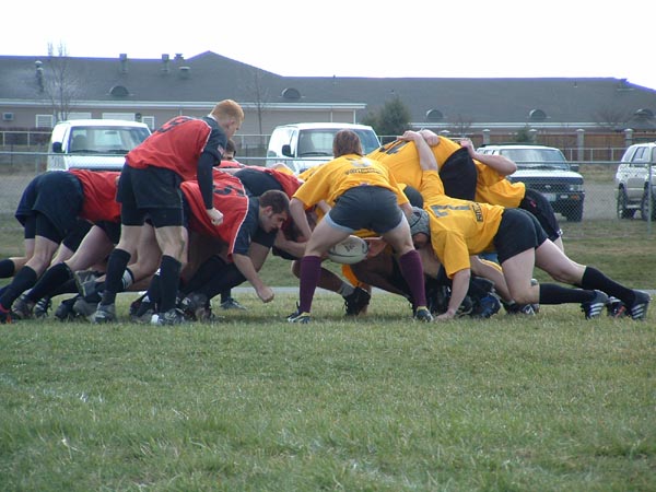 This set piece is called a "scrum." This happens when there is an infracment agains another team. This includes a knock on (when you drop the ball and it falls forward), a forward pass, or when the ball is stuck underneath people and it can not get out. Here, Western Oregon Univeristy is on the left (playing defence on this one) agains Tri Cities Men's Team. The yellow team is on offense so the scrum half (guy in the maroon socks) puts the ball between the two teams. The man in the middle is called the "hooker" and he kicks the ball back to his team. In this the defense can "drive over" the other team to take the ball, or spin the scrum 90 degrees to gain possesion of the ball. In this one WOU drove over and took the ball.