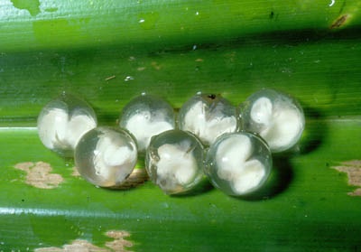 Some frogs, like the Coast foam-nest treefrog, actually mate in treebranches overlooking static bonds and streams. Their egg masses form large cocoon-like foamy masses. The foam sometimes cakes dry in the sun, protecting the inside moisture. When the rain comes along, after developement of 7 to 9 days, the foam drips down, dropping tiny tadpoles into the river or pond below.