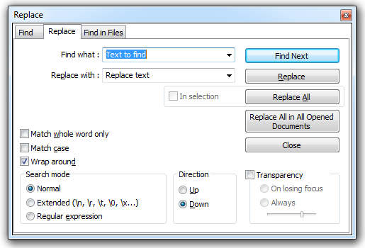 The most important change is that the Selection only checkbox now applies to the Replace All operation. will replace all occurrences of the query with the replacement text. will perform a Replace All operation on all the documents that are currently opened in Notepad++. Likewise, performs a replacement across all files of a certain type(s) in a folder; it is available from the Find in files dialog, and uses all its applicable options.