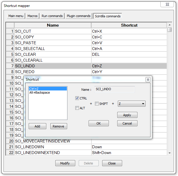- Shortcuts for Scintilla. Only the primary shortcut is displayed in the list, but when editing the command all of them will be listed.